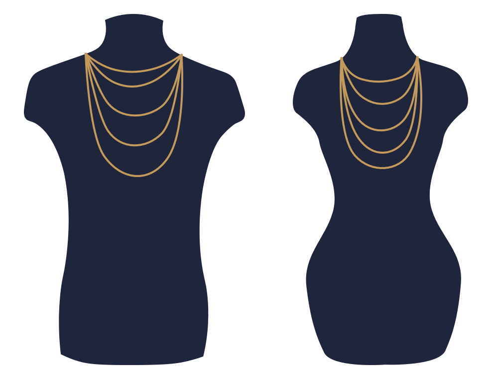 Measure the length of your chosen chain or necklace using a flexible tailor’s tape, string, or cord to determine its fit. The diagram below indicates the approximate fit of each length for males and females, from left to right. Please note that this may vary based on your physical characteristics.